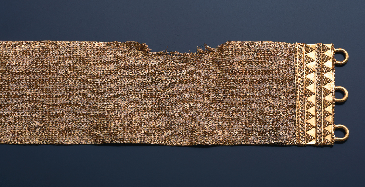 This gold band is made of extremely fine gold wire, bent into double loops and linked together to form long chains. These chains were then laid alongside each other and interlinked with the aid of wire loops running across the grain. The band was probably part of a belt that was fastened using strips of cloth or leather. | North-western Iran (Ziwiyeh), 8th–7th century BCE, gold wire, granulation, l. 49.5 cm, w. 4.5 cm, inv. no. 8.121.65
