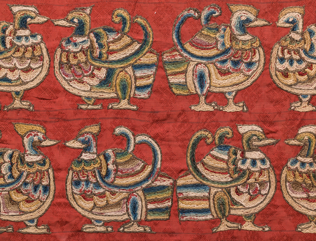 The rows of ducks on this fabric are embroidered onto a tone in tone damask-like ground. Why some of them are turned through 90 degrees is not known. One possible explanation is that the cloth was intended to be cut up into strips to be used either horizontally or vertically. The only other bird, possibly a peacock, is visible on the right selvage, the original edge of the embroidery. | Eastern Central Asia, 7th–8th century, silk embroidery on silk damask, h. 52.5 cm, w. 131.5 cm, inv. no. 4902