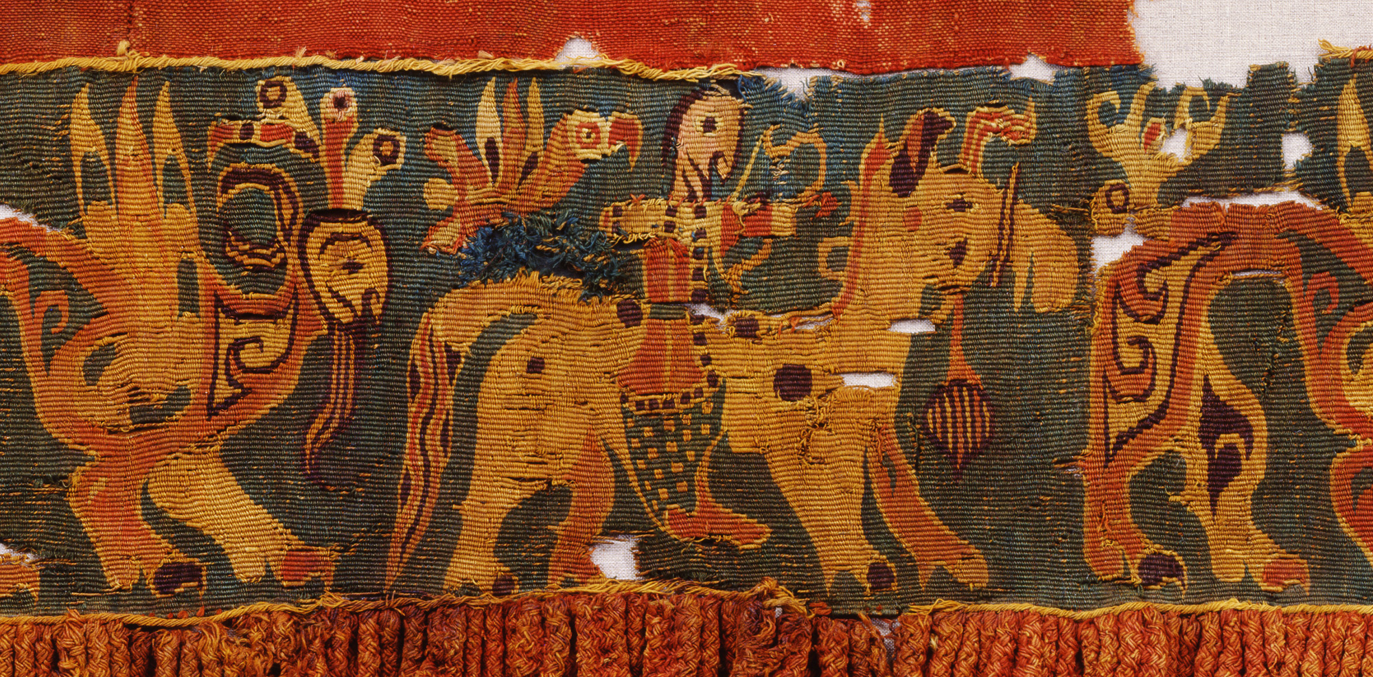 This archer on horseback accompanied by a bird of prey shown in hot pursuit of a winged chimera with the body of a beast and the bearded head of a man is a most unusual motif. The scene rests on the mythological traditions of Western Asia adapted to Steppe culture. Here, expressive stylisation goes hand in hand with an astonishing realism, evident in the horsemen’s attire, for example. | Eastern Central Asia (Xinjiang), 1st–3rd century, wool (tapestry, twill oblique interlacing), h. 47 cm, w. 92 cm, inv. no. 5138