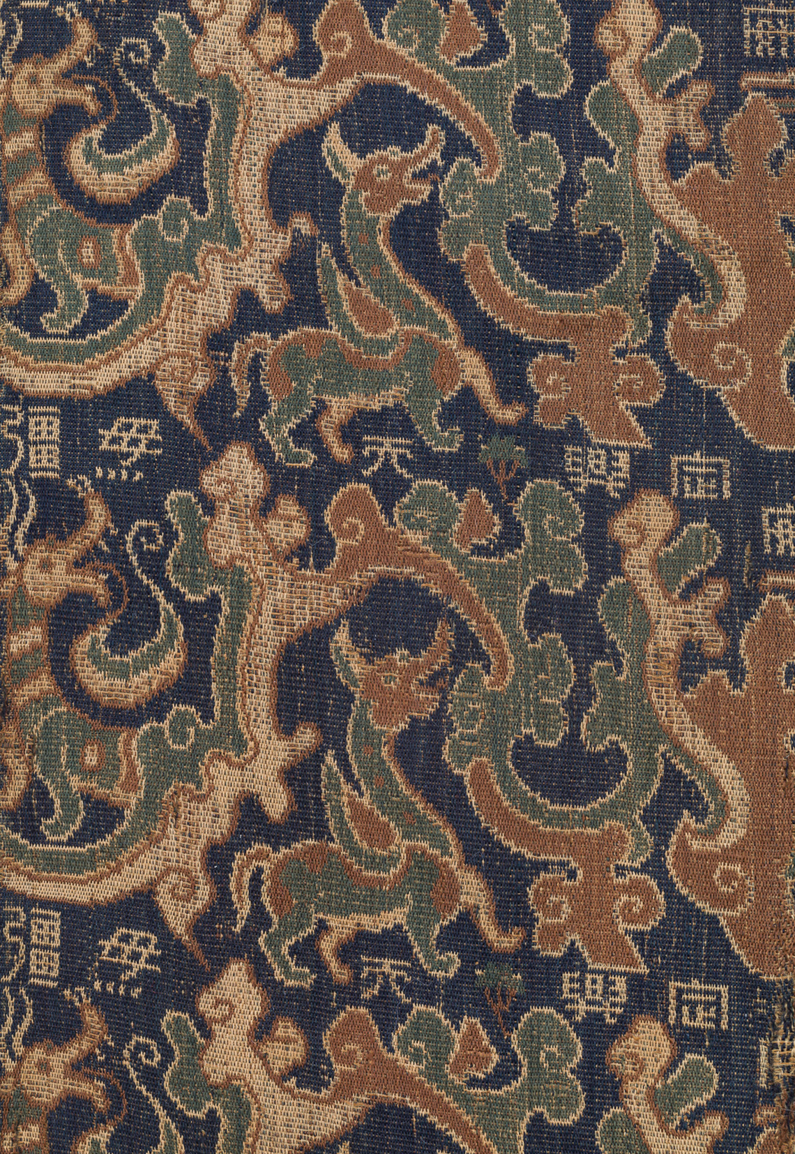 Having survived only in part, the original three-dimensional form of this garment can no longer be reconstructed. The silk is populated by four-footed beasts and birds which inhabit a stylised, paradisiacal landscape of mountains or clouds. The Chinese characters expressing hope and good wishes scattered among the creatures provide a formulaic reinforcement of the visual message of the images. | China, Eastern Han Dynasty, 1st–2nd century, silk (warp-face compound weave), pattern repeat h. 8,5 cm, inv. no. 5301/5303/5336