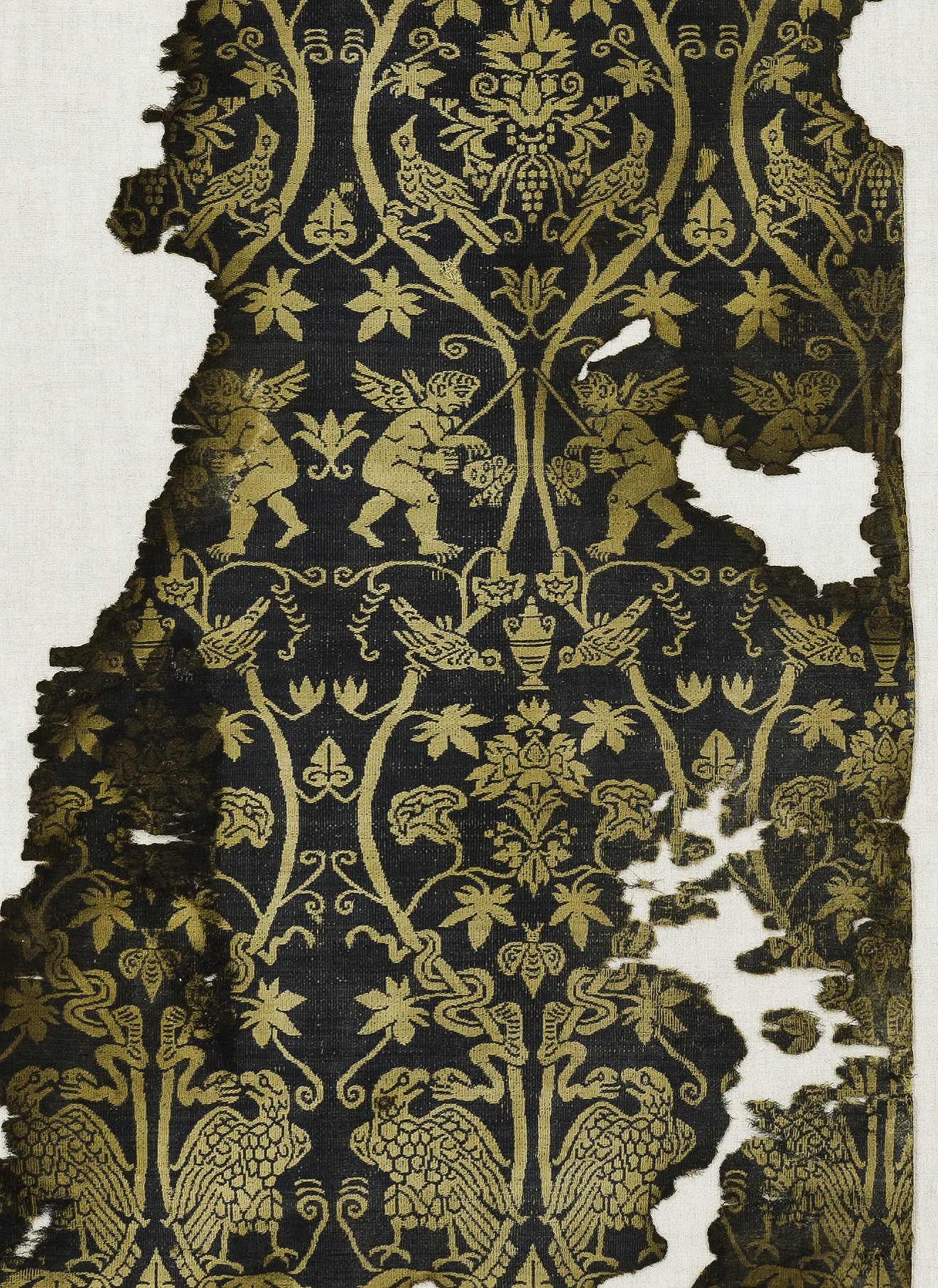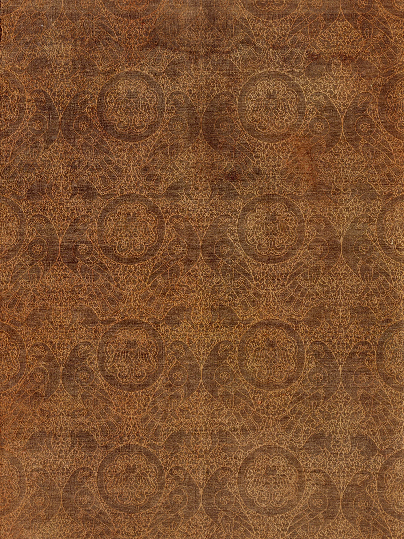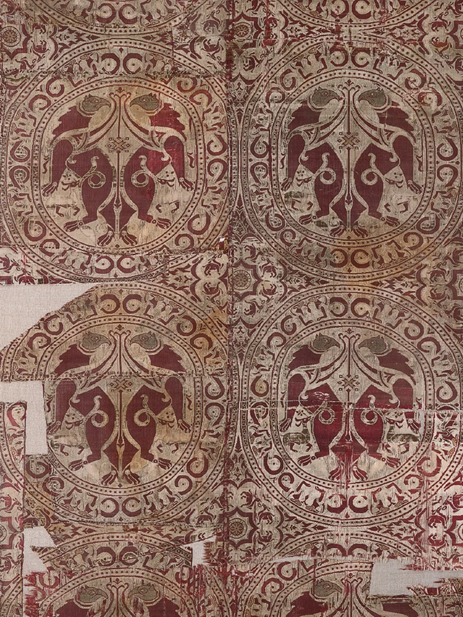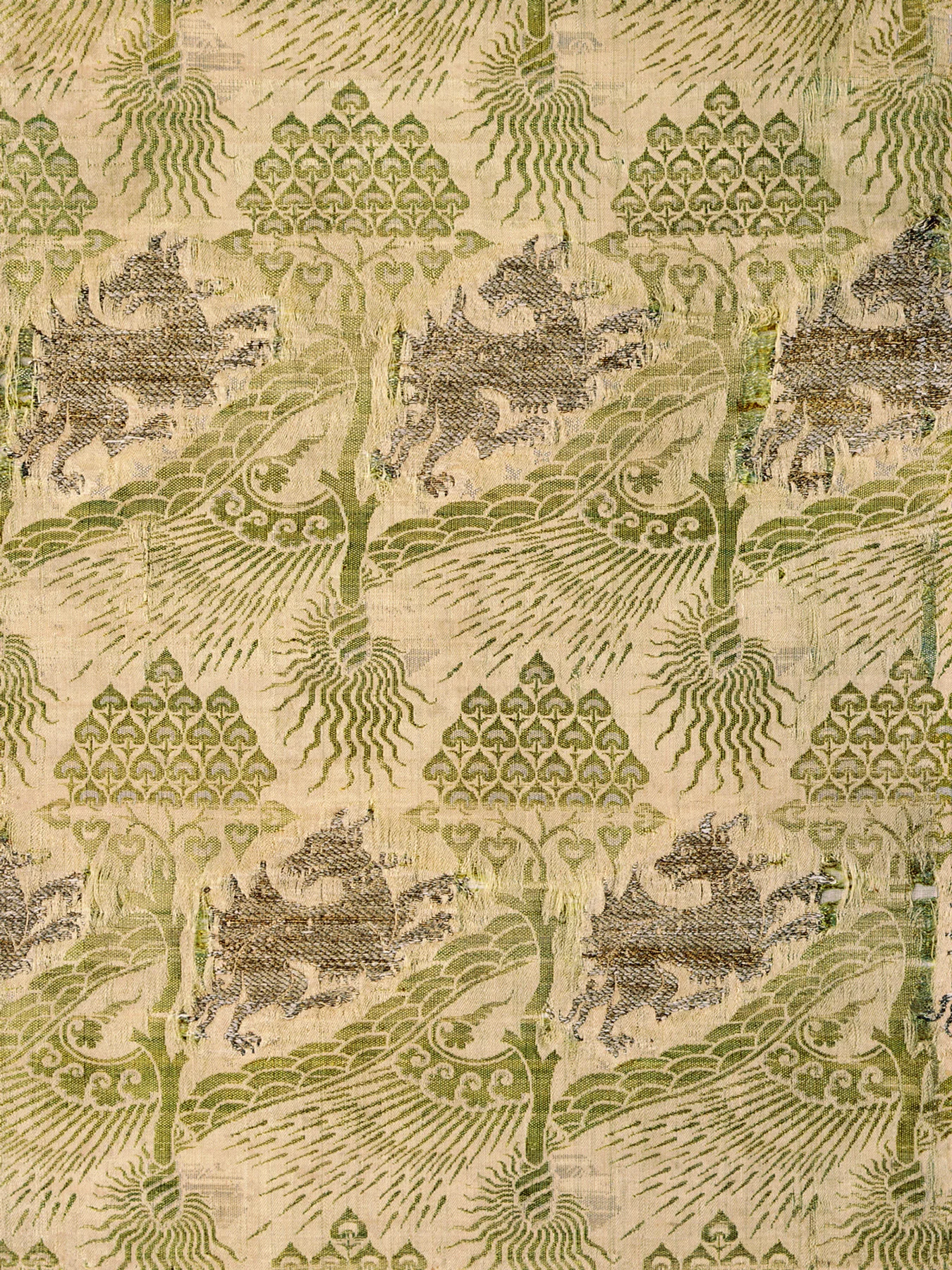 For the Mongols who starting in 1206 forced first China, then Central Asia and Persia under their yoke, gold was not just an extremely valuable material but also the colour of their ruler, which meant that it had deep cosmological significance. Intricate outlines of the pattern are all that remains of the red ground, indicating that the silk was almost entirely golden in appearance originally. | Eastern Iran or Central Asia, late 12th – 1st half of the 13th century, gold-patterned silk (lampas), h. 127 cm, w. 84 cm, inv. no. 4905