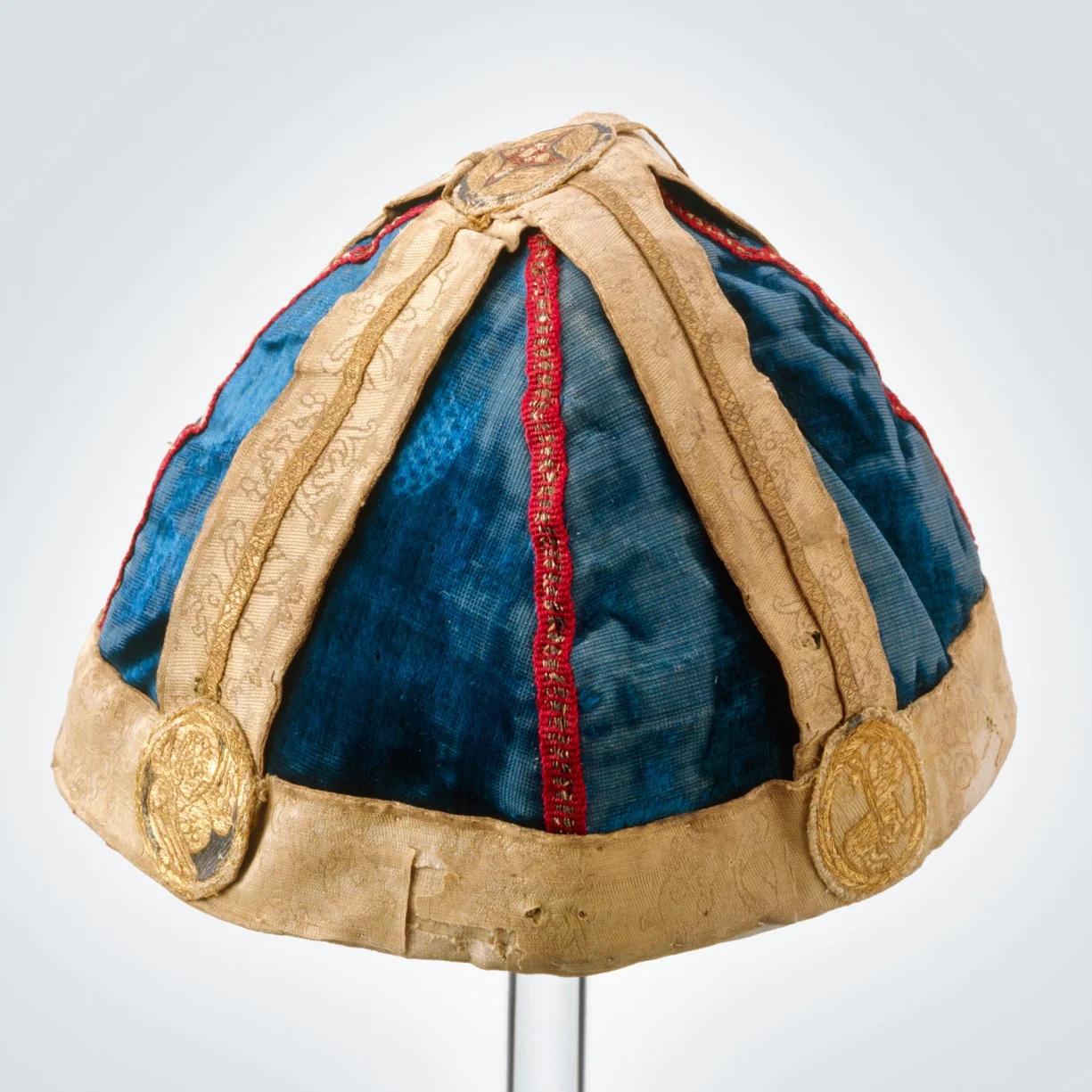 This headdress with side pieces like wings originally retained its shape with the aid of inner stiffening and ribbon ties only. It is embroidered with phoenixes chasing after a flaming pearl. The phoenix has been identified with the red bird, the Bird of the South which stood for the empress, although it was not reserved for her alone at the time of the Liao Dynasty. The crown was undoubtedly worn by a woman and was adorned with still more red and blue silk ribbons that have likewise been preserved. | Northern China, Liao Dynasty, 1st half of the 11th century, silk gauze, embroidered with strips of gilt paper and silk, h. 72 cm, inv. no. 5250