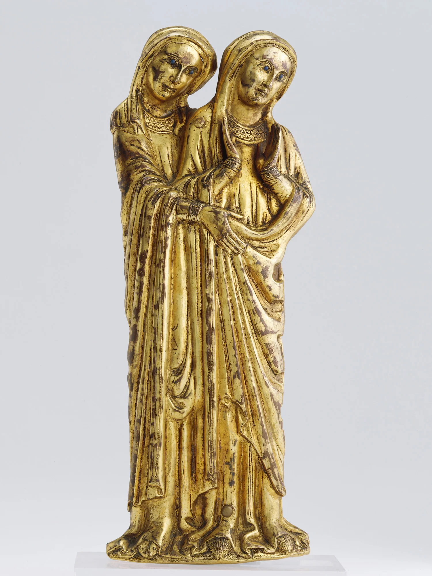 Limoges was a thriving centre for the manufacture of enameled liturgical plate in the High Middle Ages. Its workshops produced not just small items but also monumental reliquary shrines and altar frontals. This relief of the two grief-stricken Marys originally belonged to a larger crucifixion scene which also showed the Apostle John at the foot of the cross. Probably, it was part of a Passion cycle mounted on a shrine or altar frontal with enamelled ground plates. | Limoges, 1240–1250, copper gilt, embossed, h. 24.1 cm, inv. no. 8.59.63