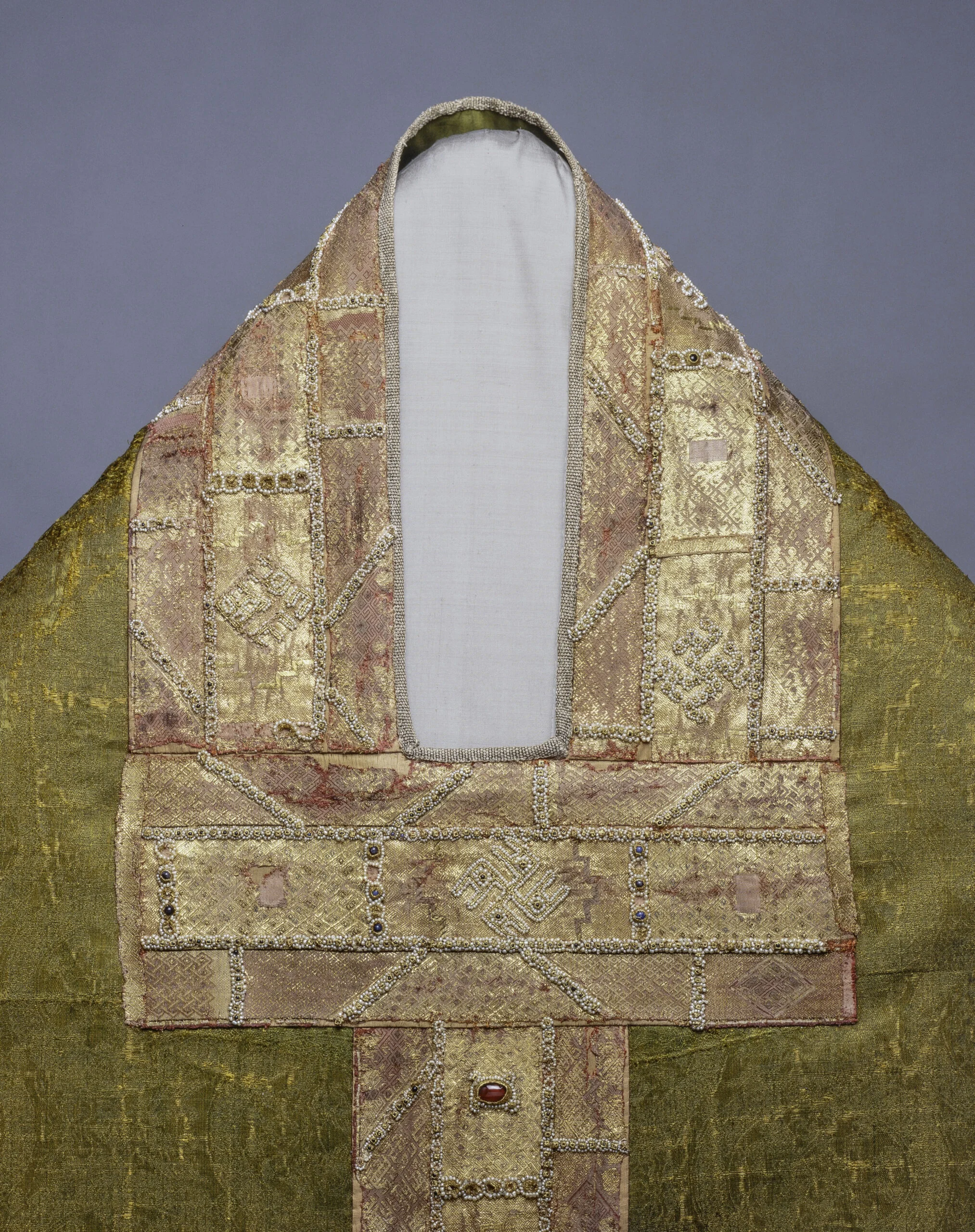 The chasuble comes from St Peter’s Abbey in Salzburg, where it was venerated as a vestment of the canonised Bishop Vitalis. The green silk is finely patterned with circular medallions, each containing either a pair of griffins or a pair of panthers. The gold orphreys on the neck and central seam are embellished with semi-precious stones and pearls. The artistry and faraway origins of oriental silks such as these made them treasured items in the West. Made up into vestments, they endowed their wearers with dignity, rank and prestige. | Byzantium or the Orient, 1st half of the 11th century, silk (samite), tablet weaving, pearls, semiprecious stones, h. 152.5 cm, inv. no. 232