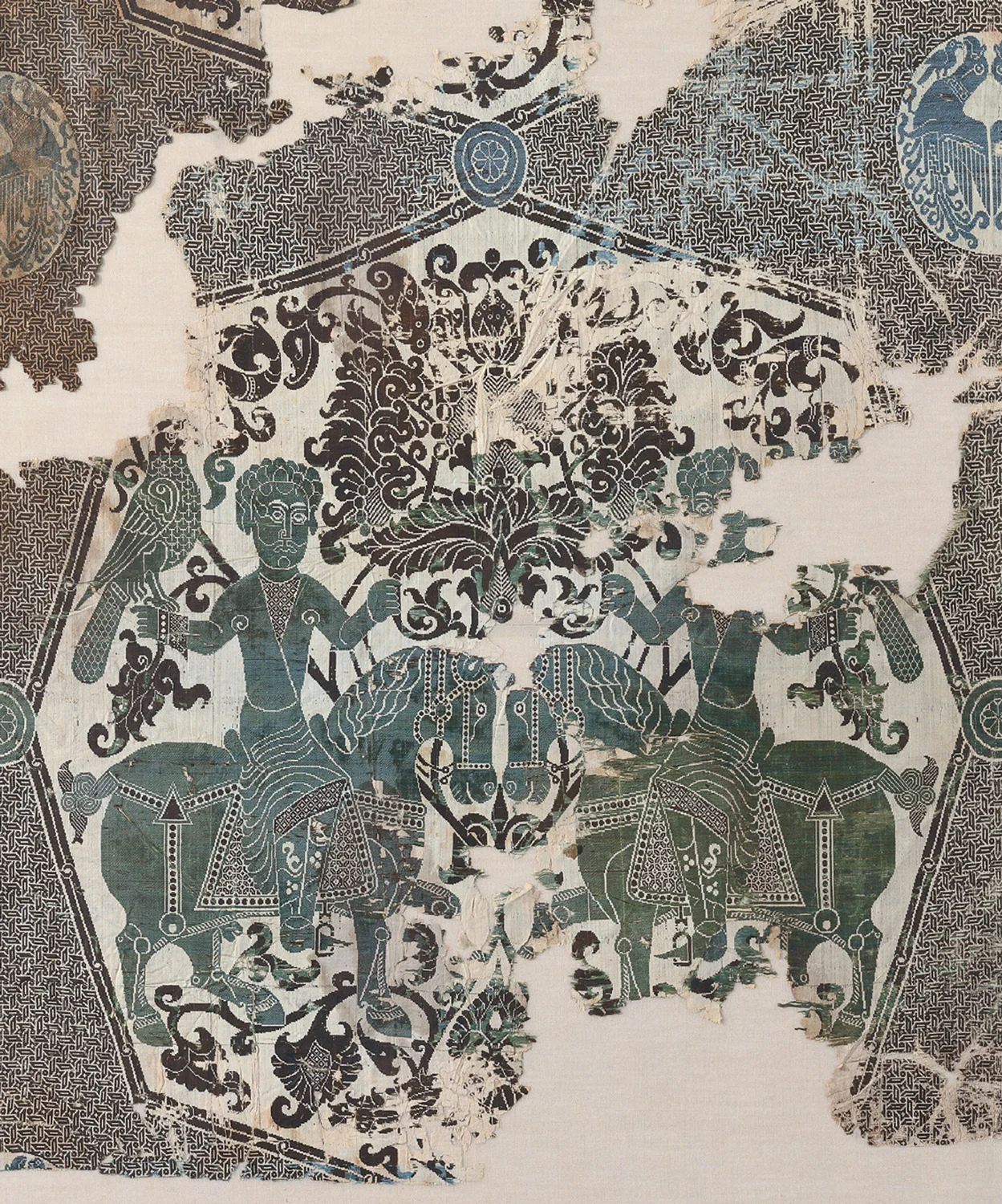 This beautiful silk is patterned with large octagonal medallions, each of which contains two falconers on horseback, their falcons perched on their arms, flanking an extravagant tree. The motif is remarkable for its intricacy and finely drawn lines. The falconers’ robes, highly ornate boots and saddlecloths and the superbly decked out horses are all reproduced in lavish detail. | Iran, 11th century, silk (double-weave lancé silk), h. 152 cm, w. 117 cm, inv. no. 1143