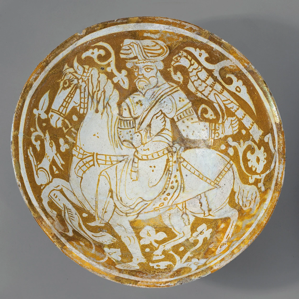 Among the most exceptional artefacts produced under the new Fatimid Dynasty in Egypt (969–1171) was lustreware decorated with figural scenes, of which this bowl is an excellent example. Remarkable for its vitality and expressiveness, the motif done by reserve technique was drawn with free-flowing brushstrokes against a lustre-coloured ground. Its theme – falconry – reflects life at the Fatimid court. | Egypt, 10th–11th century, earthenware, lustred decoration, diam. 24 cm, inv. no. 3.101.68