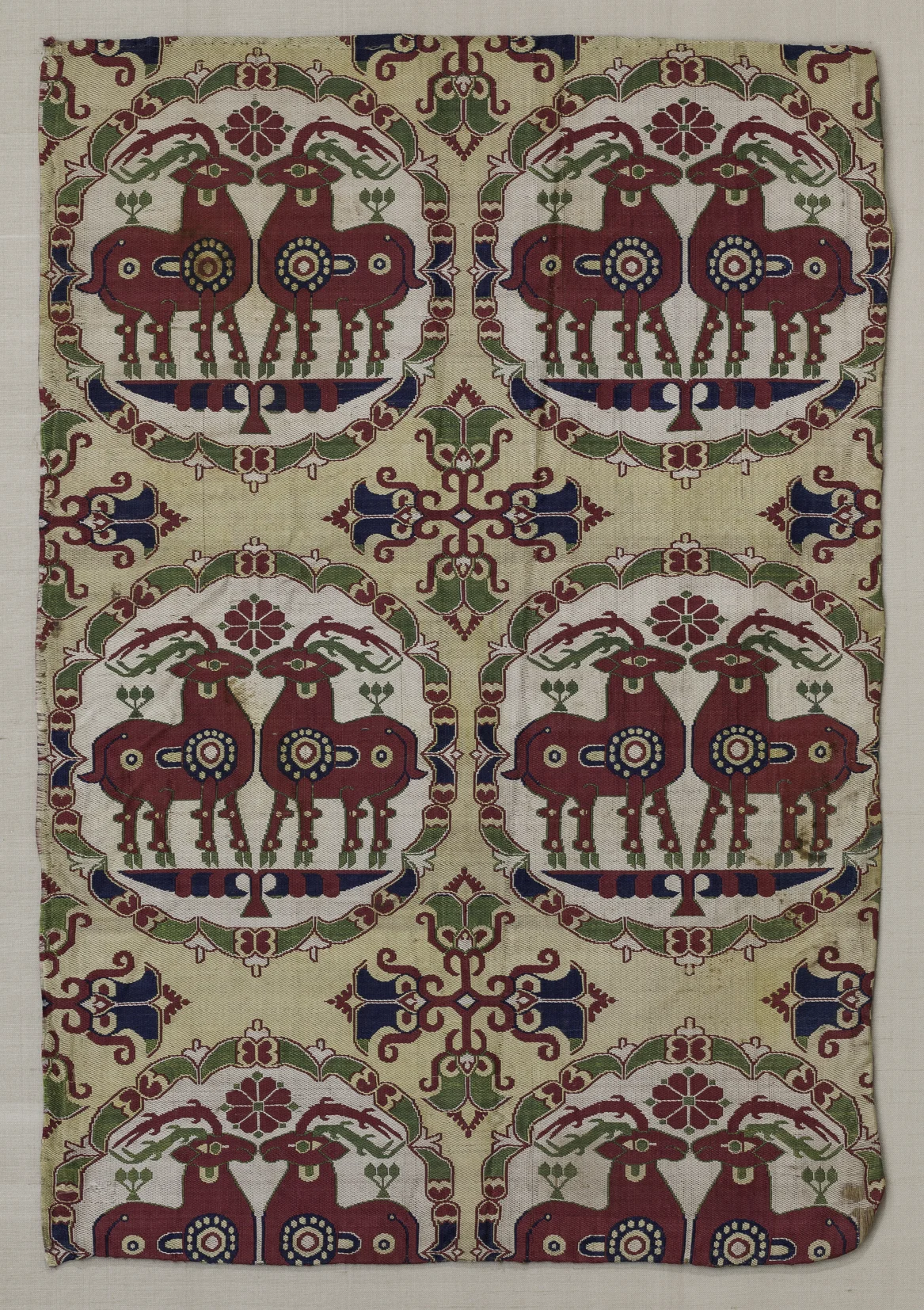 Circular medallions, classically framed by beads, count as the most important and most distinctive design element of Persian silks. Variations of such medallions influenced silk weaving from China to Byzantium for several centuries. This particular silk shows pairs of heavily stylised deer inside flower-bud medallions. The brightly coloured, almost naïve design is exceptionally well preserved. | Central Asia, 7th–8th century, silk (samite), h. 52 cm, w. 35.5 cm, inv. no. 4901