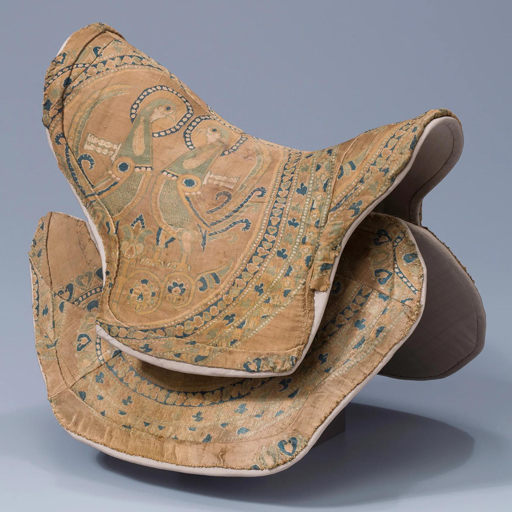 This heavy silk saddle cover was woven out of eight different colours of thread. Originally brightly coloured with a red ground, it has now paled to beige owing to the instability of the dyestuffs. The saddle itself was made of wood and the pommel and cantle would have had metal trimmings. | Central Asia, late 8th–mid-9th century, silk (samite), l. 64 cm, inv. no. 4866/4870/4906/4922