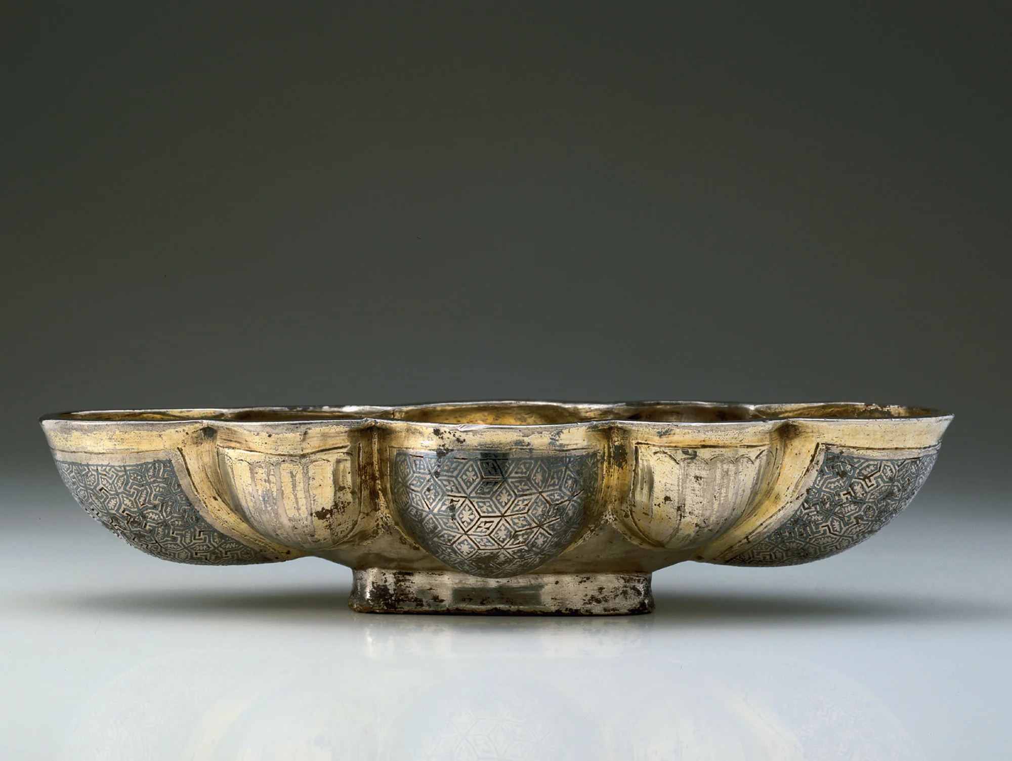 The courtly culture that developed under the Sasanids, the dynasty that ruled Persia in Late Antiquity (224–642), produced some outstanding silks, fine metalwork and glassware. This shallow, lobed bowl shows the Sasanid art of goldsmithing at its zenith. Adorned with fine ribbing and black niello ornaments on the outside, the well is decorated with a running boar. | Iran, 5th–6th century, silver gilt, embossed, niello, l. 24.6 cm, inv. no. 8.123.65