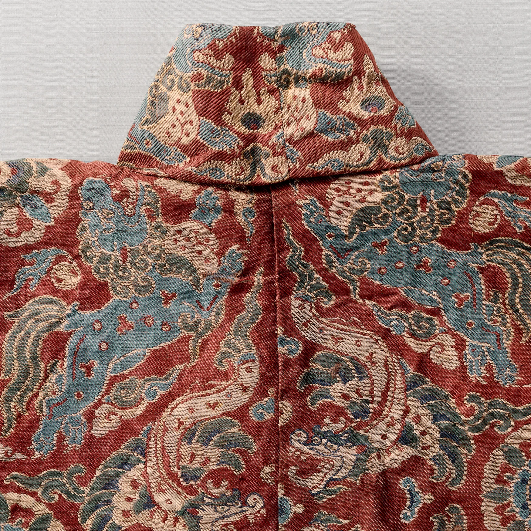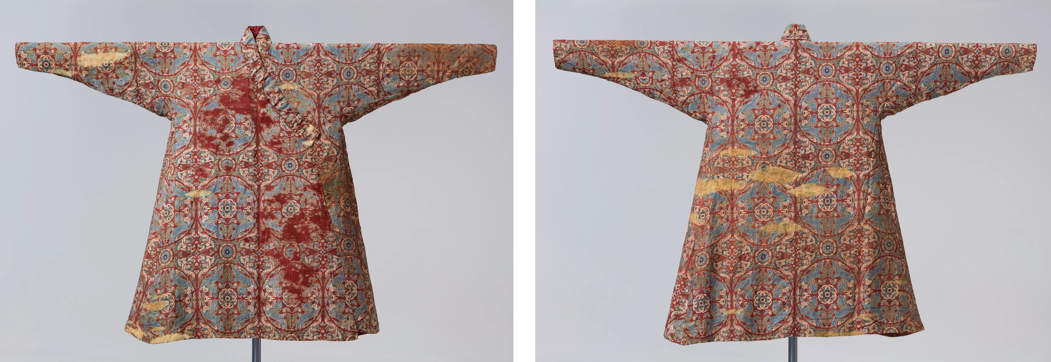 This robe is known to have been the outer garment worn on top of several other layers. Perhaps this helps explain its size, which seems far too wide for a woman. The robe was probably tied at the waist with a belt. Such belts were often made of precious metal and like jewellery counted as status symbols. The medallions are formed by four lions chasing a flaming pearl, while four dragonfish facing a diamond-shaped ornament occupy the spaces in between. | Northern China, Liao Dynasty, 1st half of the 11th century, silk (samite, weft-faced on both sides), padded and lined, h. 148 cm, inv. no. 5239