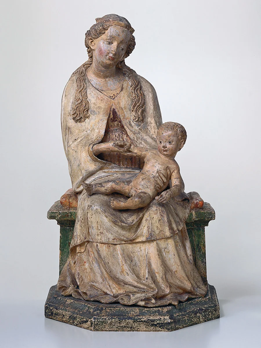 With her head bowed slightly to one side, Mary gazes at the unclothed Christ Child in her lap, tenderly holding his right hand in her own, in a gesture of betrothal. The fingers of her left hand pressing into his pliant flesh can be read as a subtle allusion to what will be his sacrificial death on the cross. The sculpture attributed by some scholars to Hans Multscher (1400–1467) combines the soft palette and elegance of International Gothic style around 1400 with restrained but no less affecting modelling. | Middle Rhine, ca. 1425–1430, walnut and soft wood, polychromy, h. 67 cm, inv. no. 11.44.75
