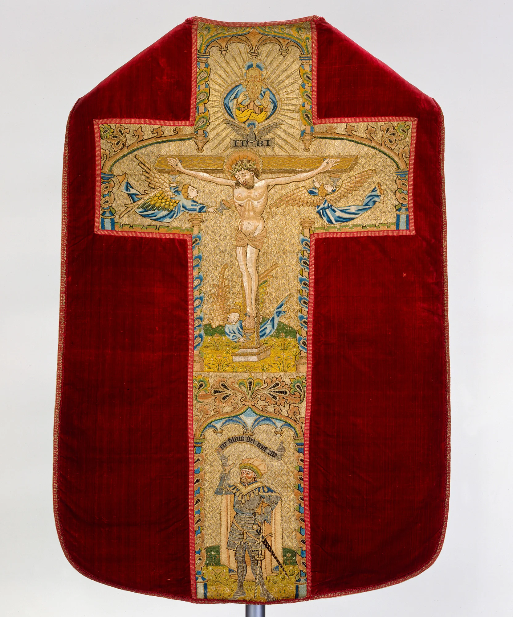 In keeping with the function of the chasuble as a liturgical vestment to be worn while celebrating Mass, this orphrey is decorated with a crucifixion scene. It shows Christ hanging on the cross, mourned over by God the Father inside a radiant mandorla and surrounded by angels holding out chalices to catch the sacrificial victim’s blood. The man depicted below this scene is the centurion, who according to the Gospel recognized Jesus as the Son of God. The exceptionally fine embroidery done in gold, silver and silk thread produces some remarkable glazing effects, thus showing the influence of Burgundian embroidery of the 15th century. | England, 3rd quarter of the 15th century, gold and silk embroidery on linen, h. 115 cm, w. 61 cm, inv. no. 5527