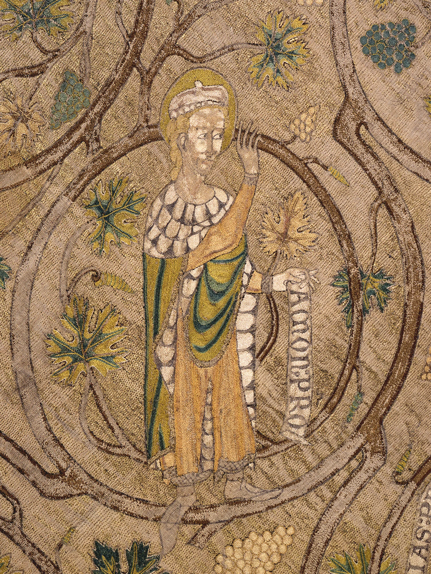 This cope was worn for processions and consecrations. It shows Old Testament prophets and kings inside medallions formed by curled vine tendrils. The root of the tree – Christ’s family tree – on the back of the pluvial was cut out at some point, but would have shown Jesse, fast asleep and dreaming. Such splendid vestments, embroidered with gold and coloured silks creating some very painterly effects, were a speciality of English embroiderers, who supplied several popes and numerous European church dignitaries, including the Archbishop of Salzburg, Conrad IV of Fohnsdorf (1291–1312). | England, ca. 1290–1300, gold and silk embroidery on linen, h. 137 cm, inv. no. 231