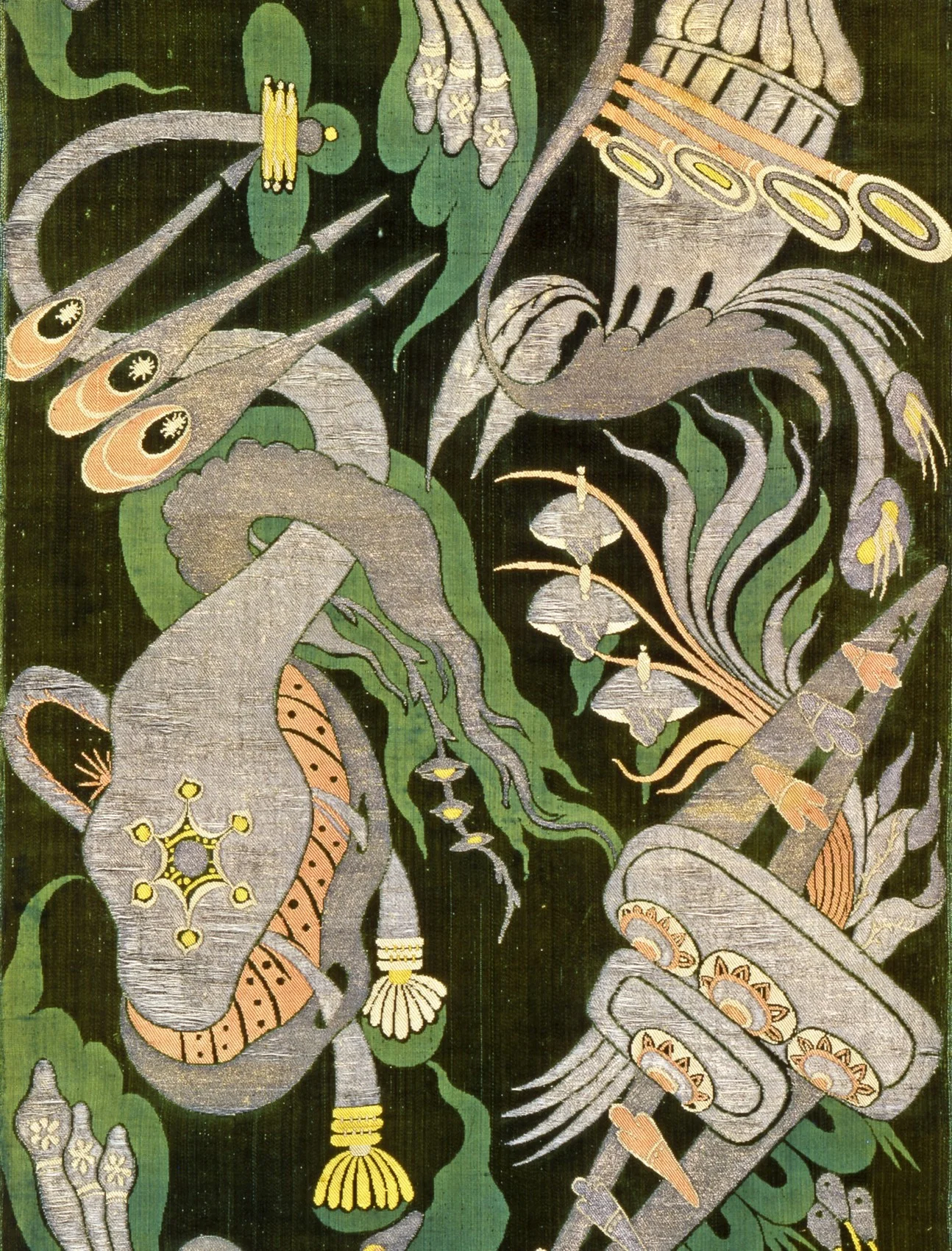 The silks later known as “bizarre silks” were popular from the beginning of the century until the 1720s. Their fantastical motifs are often hard to describe and reflect the influence of the Far Eastern models that arrived in Europe on the ships of the East India trading companies. The asymmetrical composition with diagonally arranged motifs clearly bears the stamp of Asian design principles. The green damask ground appears like a foil with motifs reminiscent of exotic sea creatures and seaweed moving across it. | France or Italy, c. 1700, silk, metal threads, h. 95.5 cm, inv. no. 260