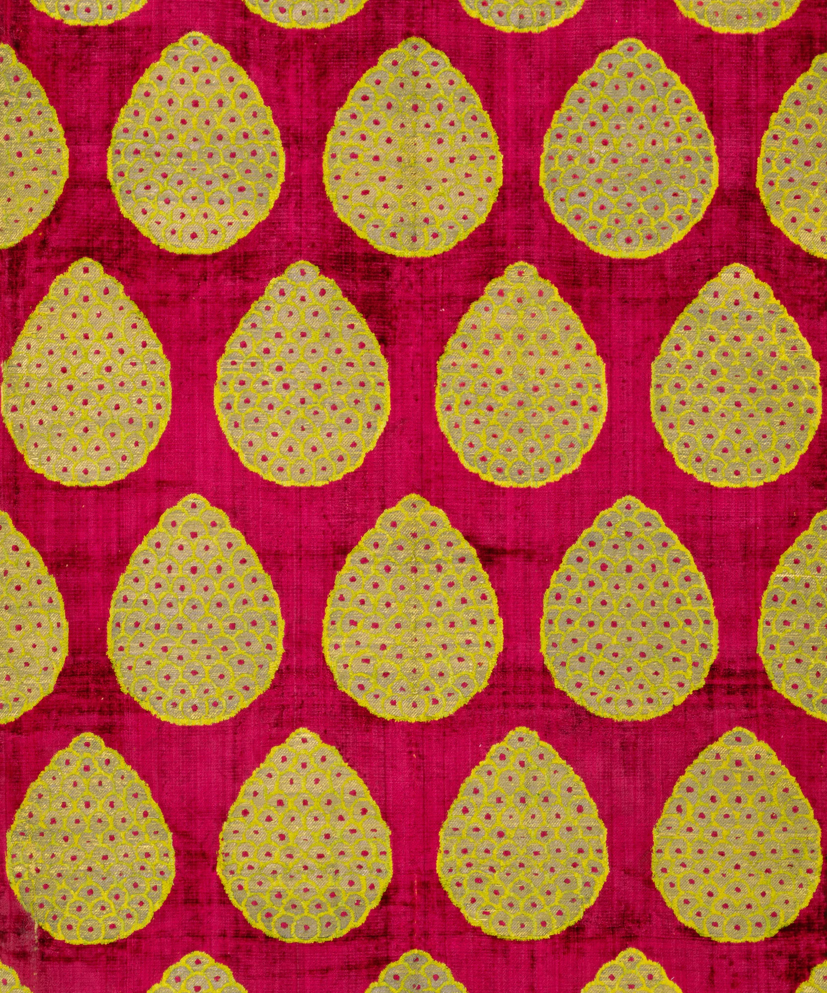 Ottoman velvets are barely distinguishable from European velvets in terms of weaving technique, but their designs often differ from the pomegranate motifs featured on 16th-century Italian weavings. This silk velvet with rows of pine cones is remarkable for the serene elegance of the pattern. The cones look almost as if they were floating on top of the red velvet pile. The yellow lines and red dots imitate the surface of natural pine cones. | Ottoman Empire, mid-16th century, silk, metal threads, h. 113 cm, inv. no. 5430