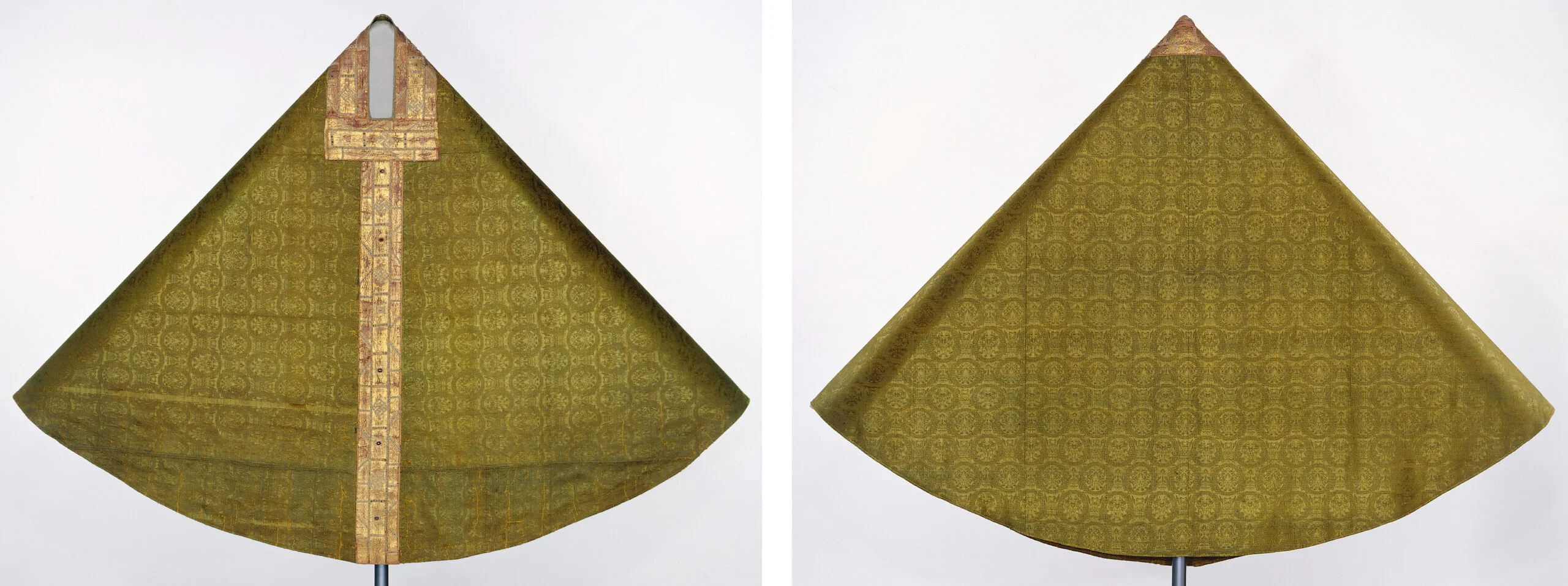 The sumptuous fabrics used to make this deacon’s vestment come from several different countries. The main fabric is an Italian lampas silk patterned with dogs and the Christological motif of the pelican feeding its own blood to its young. The sleeves are made of a Spanish silk patterned with a courtly device, while a Chinese or possibly Persian silk was used for the side pieces. The matching vestment worn by the subdeacon is to be found in the Hanseatic city of Stralsund in northern Germany, which is home to a large collection treasure of costly medieval vestments. | Stralsund, 15th century, fabrics from Italy, China or Persia, Spain and Germany, 13th–14th century, silk (lampas, samite), tablet weaving, h. 120 cm, w. 142 cm, inv. no. 152
