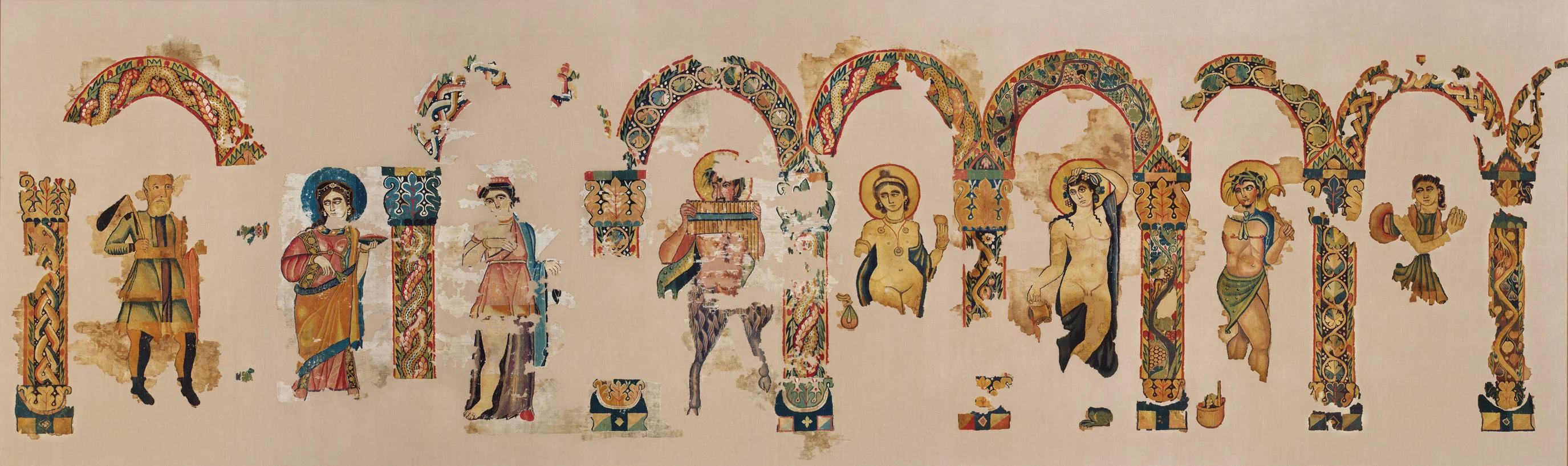 This monumental tapestry originally served as a wall hanging in a Roman private home or cult building. The programme shows Dionysos, the Greek god of wine and ecstasy, and his entourage standing underneath arcades lavishly decked out in climbing foliage and braided ornaments. The cult of Dionysos was widespread in Late Antiquity. It promised its adherents life after death and was an articulation of the desire for a life of happiness and superfluity. | Egypt, 4th century, wool tapestry on a linen ground, h. 210 cm, w. ca. 700 cm, inv. no. 3100a