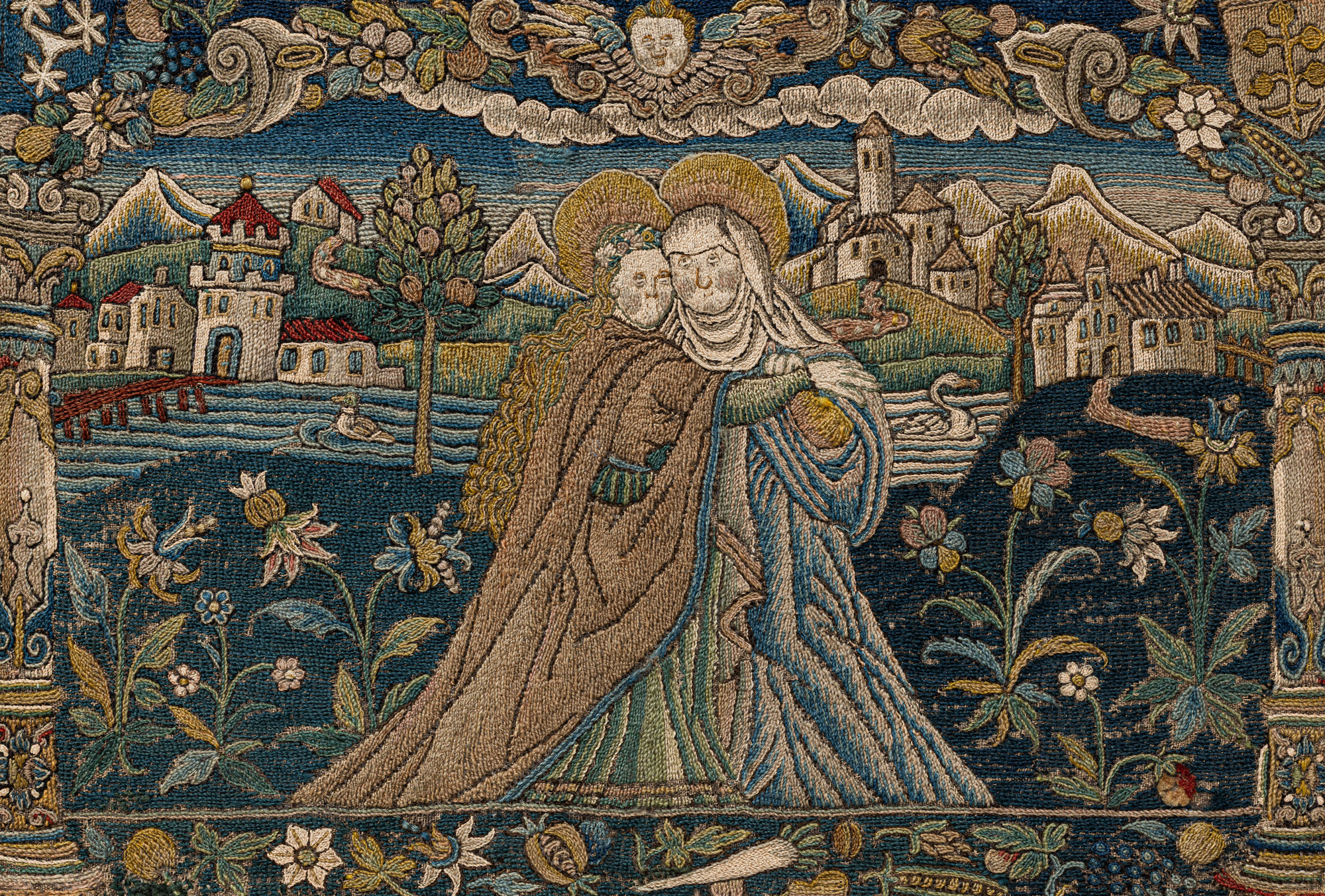 The biblical scenes are embedded in hilly landscapes rich in water sources and plants that recall the region around Lake Constance. The backgrounds are often enriched with representations of animals. | Wool embroidery showing the Visitation of the Virgin Mary to her cousin Elizabeth, Schaffhausen or southern Germany, late sixteenth century, inv. no. 924.