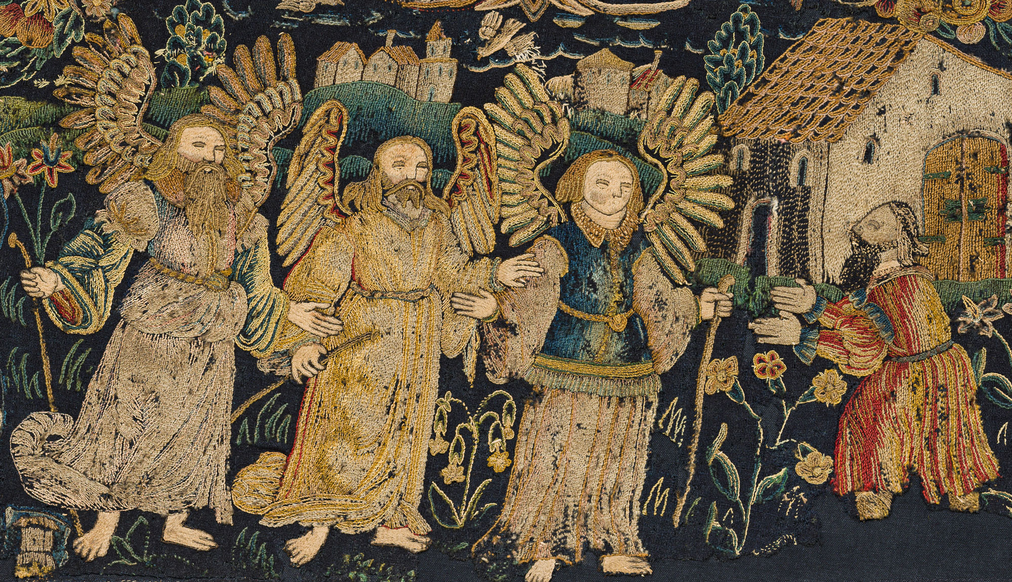 Scenes from the Bible, such as Abraham receiving a visit from three angels, were very popular.  The embroideries are remarkable for their readily intelligible and detailed retelling of the story. In addition, the virtues of the characters depicted allowed them to be viewed as models for owners themselves. | Hanging with scenes from the story of Abraham, Schaffhausen, 1596, embroidery with wool, cotton, silk and metal threads on a woollen ground, inv. no. 5125