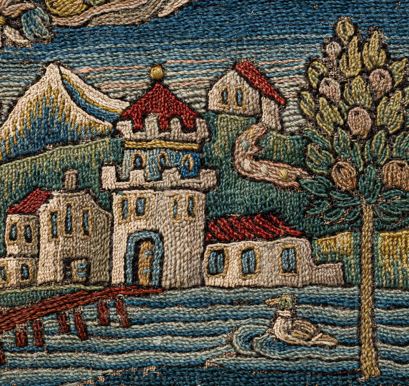 The two objects belong to a small group of wool embroideries from the region of what is now northern and eastern Switzerland dating from the period around 1600. To judge by the coats of arms, the two pieces can be traced back to Schaffhausen and southern Germany. Such embroideries were used as wall hangings, cushion covers, bed valences or table carpets in the homes of the urban elite. They thus afford us an insight into the lives led by what were then the upper classes. At the same time, these textiles with their painterly landscapes and charming details continue to enchant us even today. Press Release | Communiqué de presse